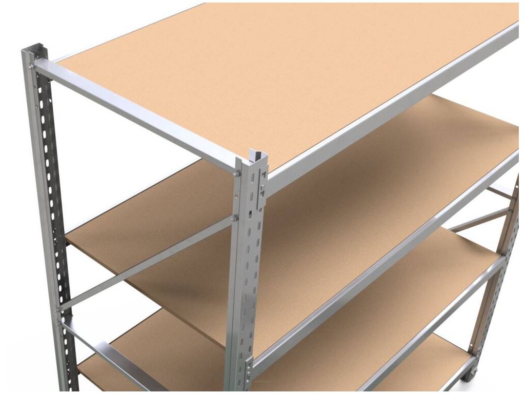 Průmyslový charakter a tedy odolnost dodává tomuto regálu i masivní dřevotřísková police o tloušťce 15mm, která zaručuje trvanlivost a dostatečnou sílu k tomu, aby police unesla deklarované zatížení 300kg/police. Stabilitu regálu zajišťuje takzvané zavětření každého bočního rámu. Jedná se o vodorovné a příčné výztuhy, které zamezují regálu v kolísání a nežádoucím pohybu.