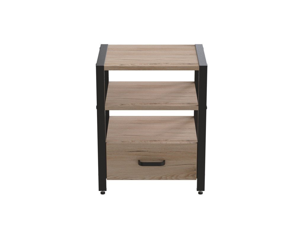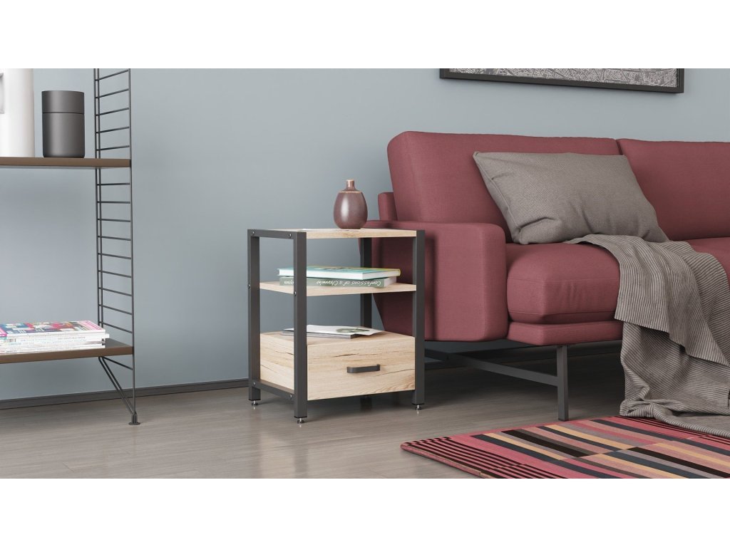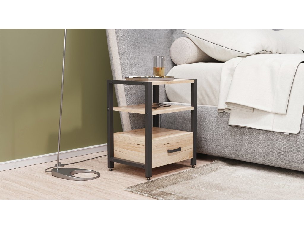 Noční stolek VIVIEN 1 s černou kovovou konstrukcí a bílou dřevotřískovou deskou o tloušťce 16 mm je elegantním a praktickým doplňkem do různých typů interiérů, jako jsou domácnosti, kanceláře či venkovské domy.