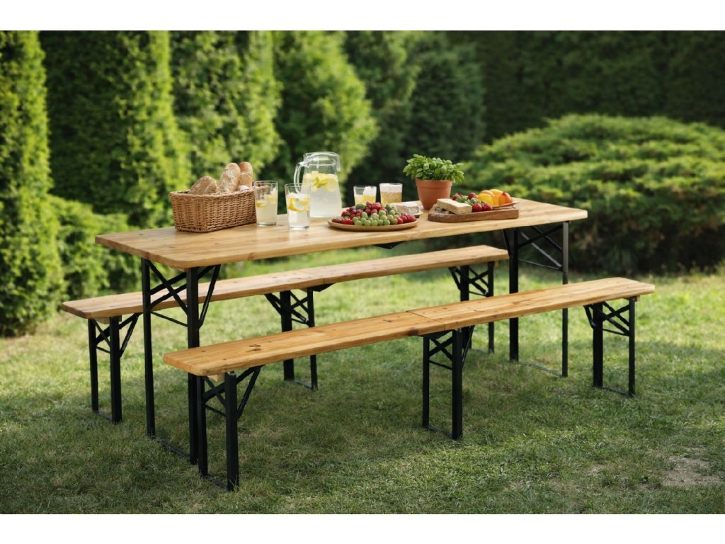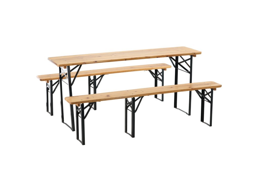 Praktická a pevná pivní souprava představuje ideální řešení pro zahradní oslavy, festivaly, grilování, dožinky i rodinná setkání. Spojení přírodního dřeva a ocelové konstrukce s práškovým nástřikem zajišťuje dlouhou životnost, stabilitu a elegantní vzhled.