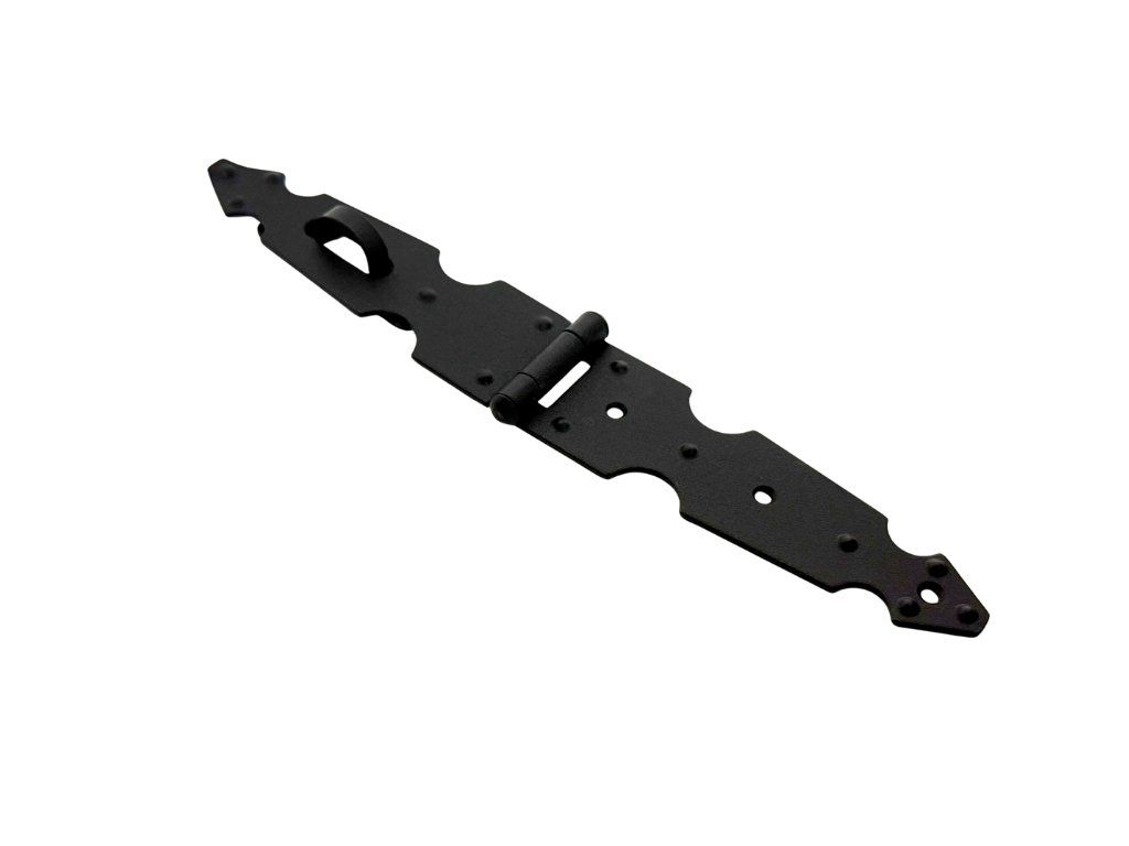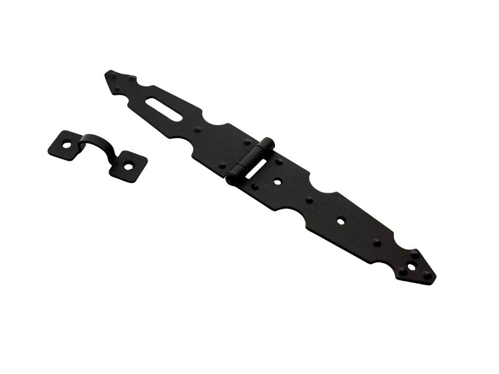 Tvoří ji pantová konstrukce s očkem (20 × 5 mm). Matný černý práškový nátěr dodává moderní vzhled a zároveň chrání povrch. Po zavření jsou šrouby překryty, což zvyšuje odolnost proti neoprávněné manipulaci. Praktické a estetické řešení pro bezpečné uzavírání nábytku.